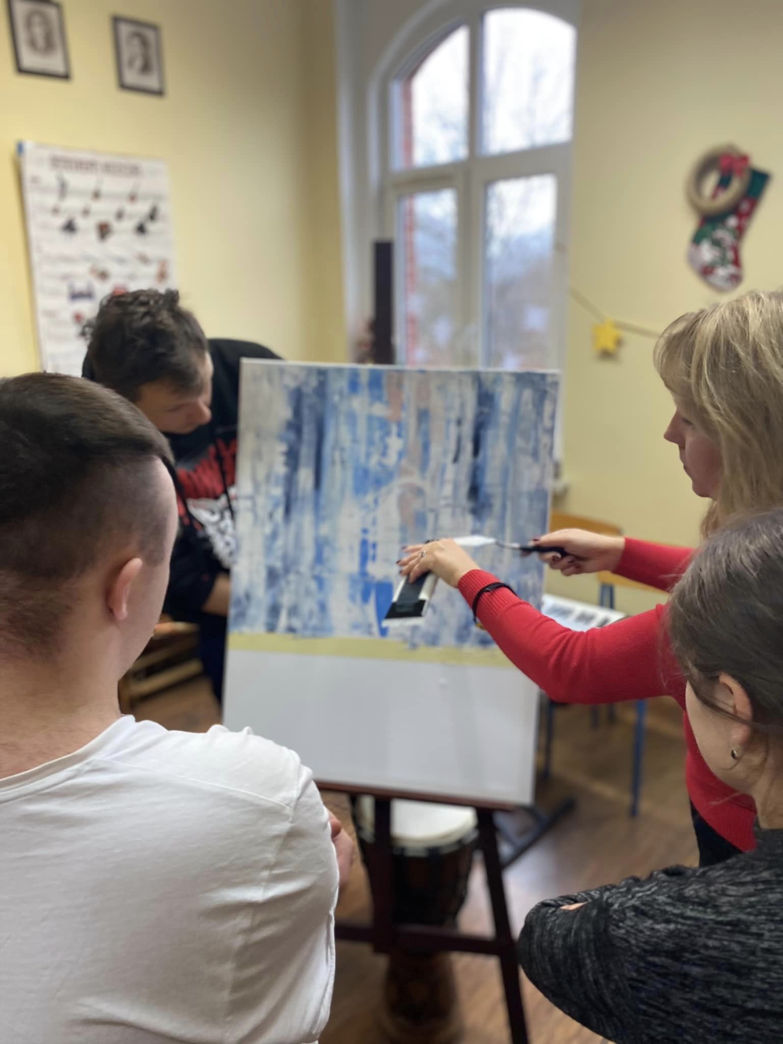 Płótno dużego formatu, sztalugi, akryle, taśma,szpachelki. Rehabilitacja 25+