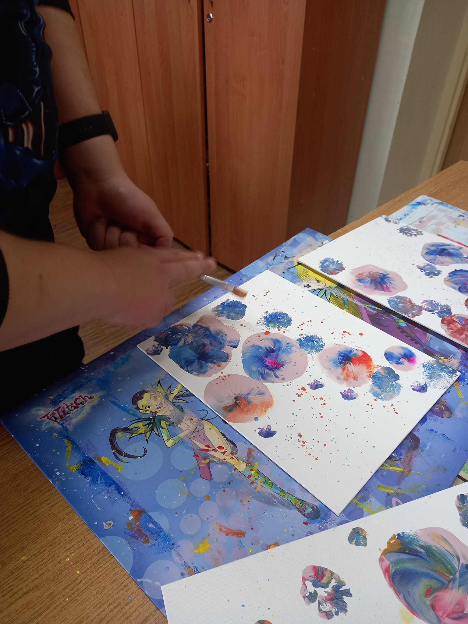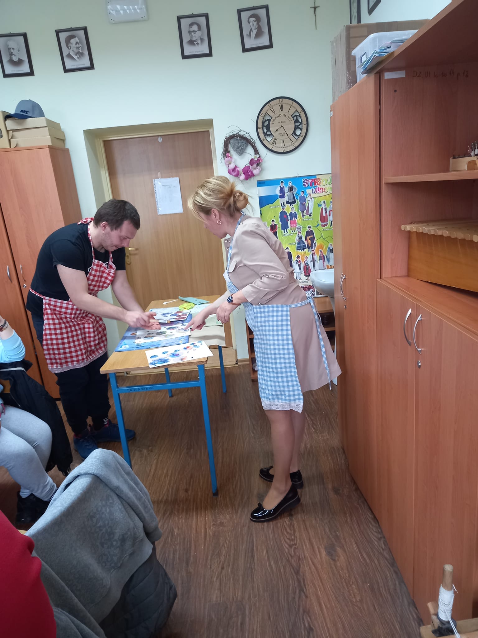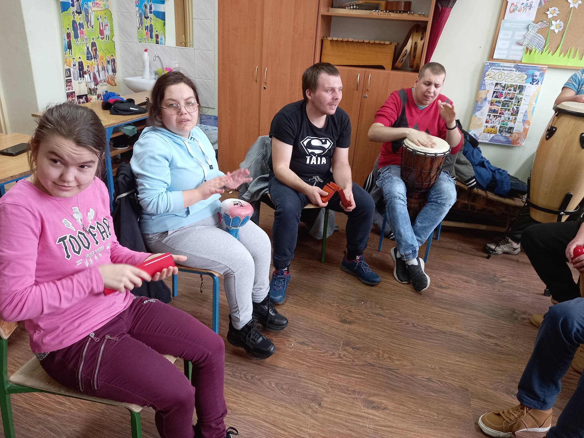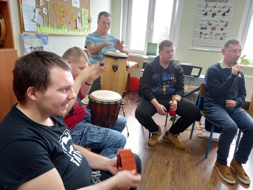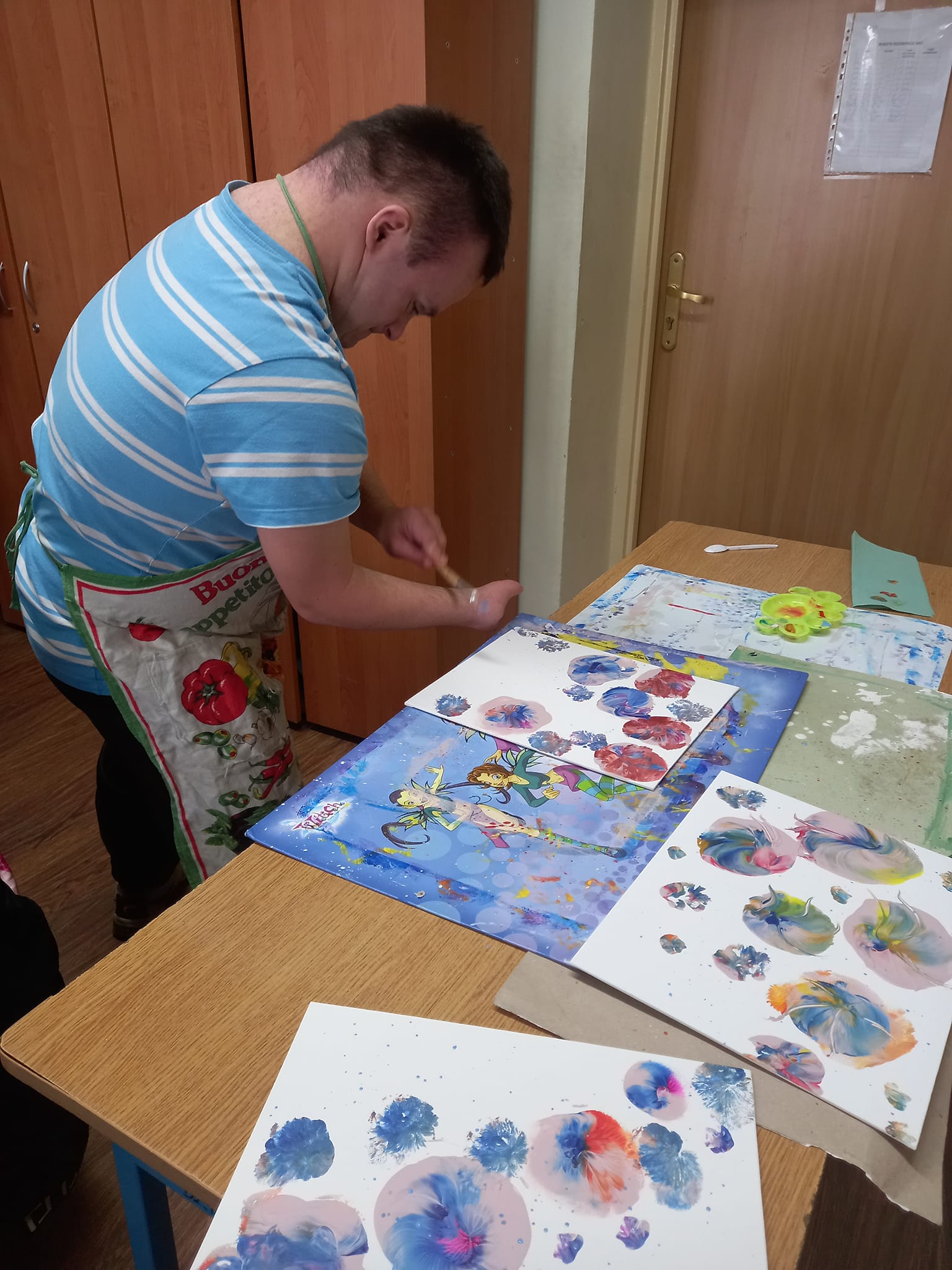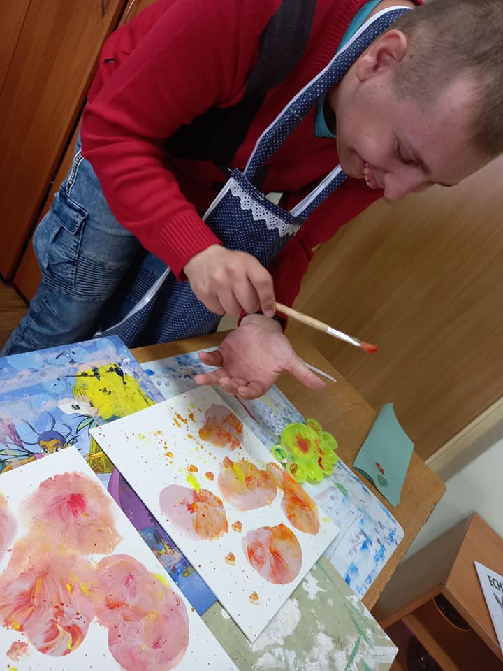 W ramach projektu Rehabilitacja 25+ finansowanego ze środków PFRON nasi absolwenci relaksują się poprzez kontakt ze sztuką, tworząc przepiękne prace malarskie z panią Anną Szczepaniak. Tym razem malowali akrylowe abstrakcje za pomocą gumowej rękawiczki wypełnionej powietrzem. Spontaniczne wykańczanie tła przy użyciu chlapiącego pędzla rodziło zabawne sytuacje. Prace będzie można obejrzeć na wystawie, która będzie zorganizowana w Żagańskim Pałacu Kultury. Po dokończeniu prac był czas na upragnione granie i śpiewanie. Każdy z uczestników towarzyszył piosence grą na instrumentach rytmicznych.